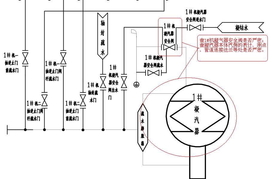 5、手动操作与凝汽器相连阀门开度:了解汽轮机疏水系统阀门状态,就地操作与凝汽器相连正压蒸汽管路阀门,操作后正压蒸汽充满负压侧管道,判断阀后管道是否存在漏点。